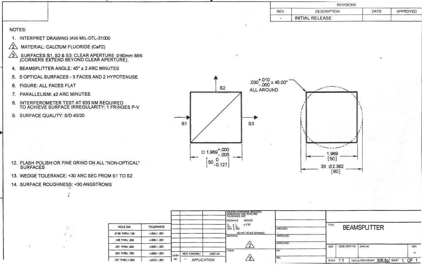 - 1.5 inch diameter by .020 inch ZnSe beam splitters fabricated to 1/10 wave flat in transmission